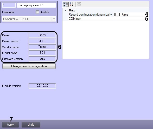Specify the COM-port for the COM port parameter (5) to which the Trezor controller is connected. To identify the COM-port number go to the Windows Device Manager.