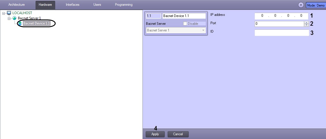 4. In the ID field (3) enter the identification number of the BACnet device.