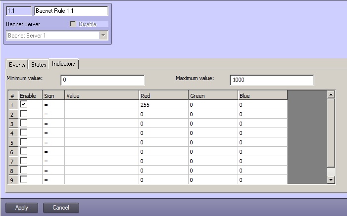 Configuring of this rule is performed on the Indicators tab on the settings panel of the Bacnet rule object. The settings description is presented below. It is possible to specify not more than 10 states of the indicator.