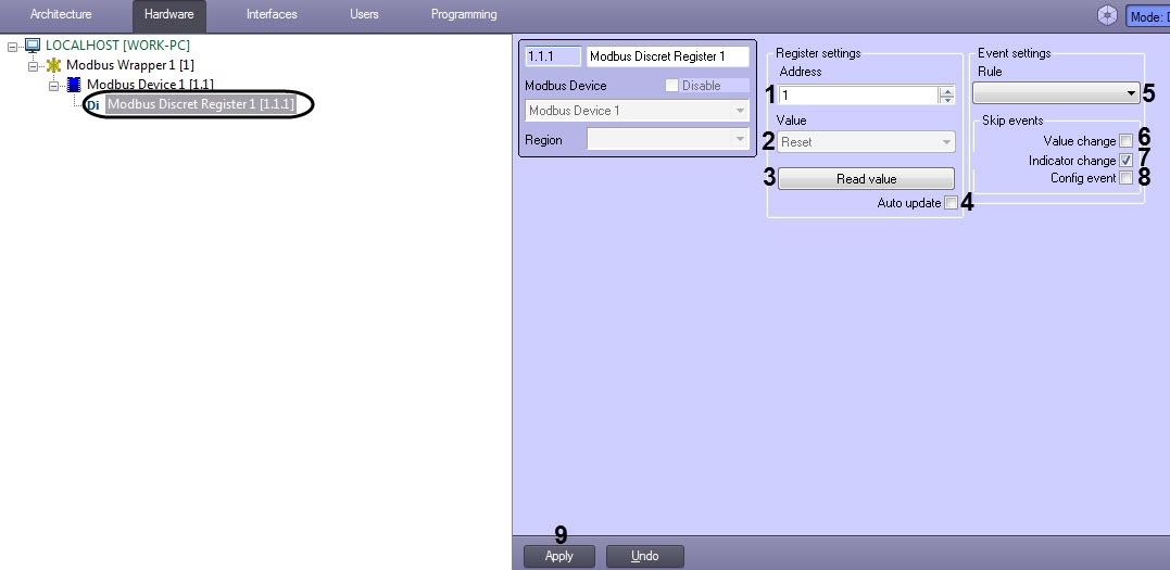 1. Go to the Modbus Discret Register object settings panel which is created on the basis of the Modbus Device object.