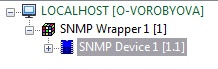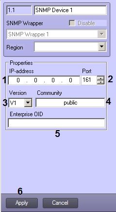Device connection via SNMP is configured on the settings panel of the SNMP Device. This object is created under the SNMP Wrapper object in the Hardware tab of the System settings dialog box.