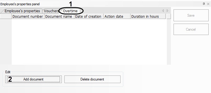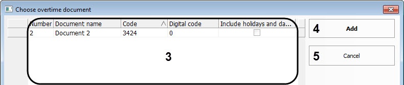 - To add overtime document to the employee click the Add document button (2). As a result, the Choose overtime document window will open.
