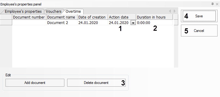 To go back to the employee property panel without adding the document click the Cancel button (5).- In the Action date field (1) select the start date of document using the calendar or enter it manually in DD.MM.YYYY format.
