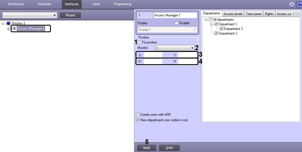 - Przejdź do panelu ustawień obiektu Access manager w drzewie obiektu Display w zakładce Interfaces okna dialogowego System settings.
