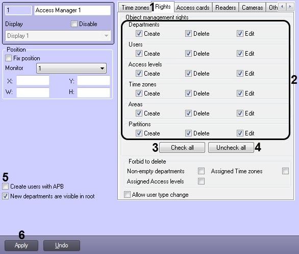 Jeśli niezbędne jest zezwolenie operatorom na tworzenie użytkowników z włączonym antipassback, zaznacz pole wyboru Create users with APB (5).