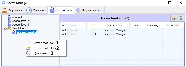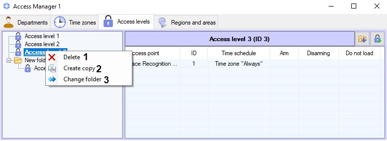 An individual access level in the root of the access level list is managed using the context menu, invoked by clicking the right mouse button on the item.