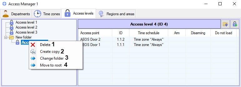 4Move to rootMoves the selected access level from the folder back to the root of the access level list.