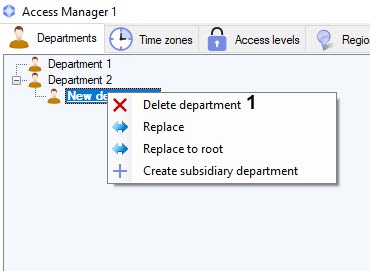 - To create department in the root of hierarchy click the right mouse button in free area of departments hierarchy and select the Create root department item in the opened functional menu (1) or click the button (2).