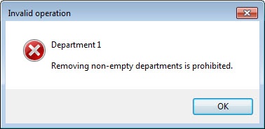 If deletion of non-empty departments is prohibited, the department can only be deleted if there are no users in it (see Wyłączenie możliwości usuwania niepustych departamentów, poziomów dostępu i stref czasowych). When you try to delete a non-empty department, the Invalid operation warning is shown.