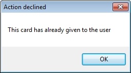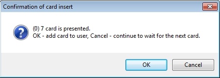 - If confirmation of card input by operator is configured, the Confirmation of card insert window will display. To assign presented card to a user click OK, otherwise click Cancel.