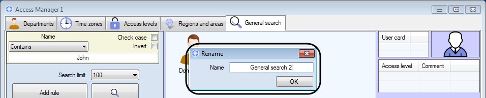 - In the opened dialog box, in the Name field, enter the new name for the search tab.