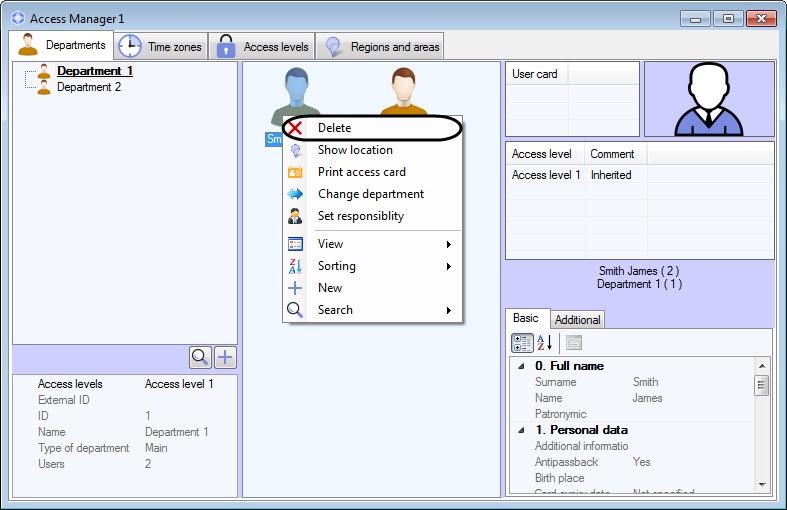 Rights for deleting a user can be limited while configuring the Access Manager module. The message about missing the corresponding rights will be displayed. See also the Konfigurowanie uprawnień zarządzania obiektami section.