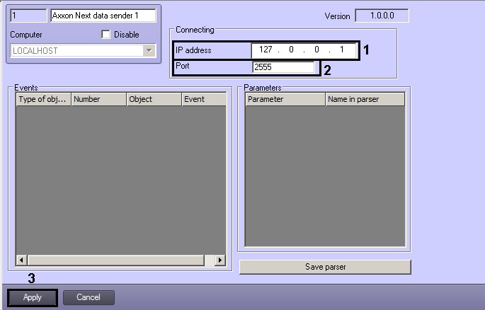- In the Port field enter the port number specified in Axxon Next when configuring the Event source object (2).