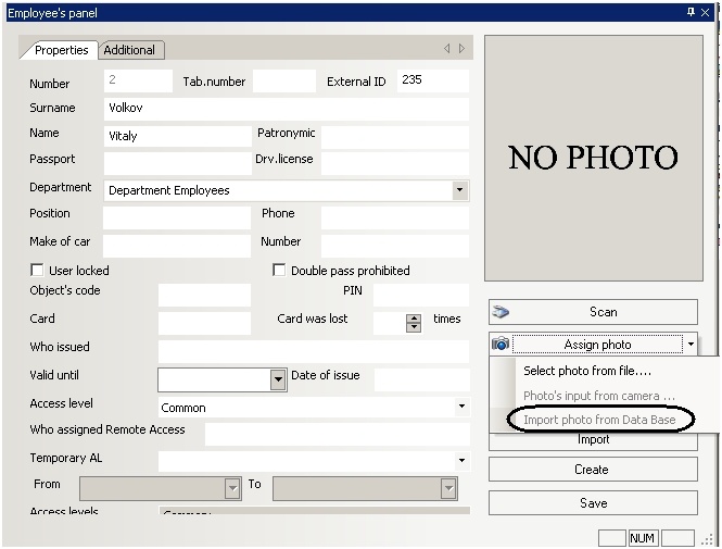 “Data import” program module is involved into assigning photo to user. For this do the following: