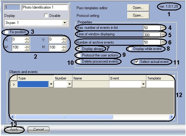 12. In the Objects and events table, add objects (whose events must cause the Photo ID window to be shown), templates, text messages, and colors (12).