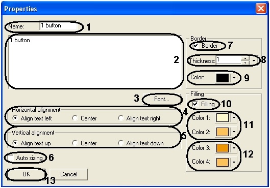 - From the Vertical alignment radio button group, select the required radio button (Align text up, Center, or Align text down). This vertically aligns the text inside the object's area (5).