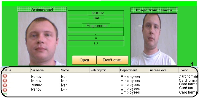 The lower part of the Photo ID window contains the operator action log (1). For each instance of attempted access, the log shows the data for the employee who attempted access, the query creation time and date, and the operator action status.
