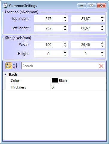 Object properties can be changed in this window. Available parameters depend on the object type. Please see the sections below for description of each parameter.