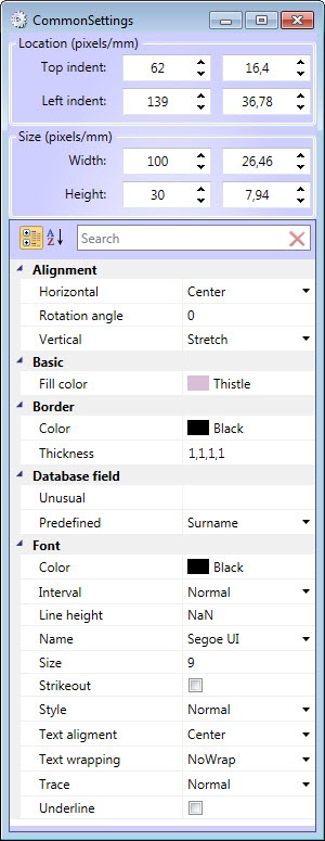 Properties of the Database field object are similar to properties of the Text object, except of Unusual and Predefined parameters. Purpose of these parameters are follows.