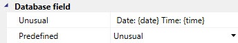 You can specify several parameters in the Unusual template string. For example, to display the date and time of the event simultaneously, enter the following template string: Date: {date} Time: {time}. As a result, for a given event, the database field will display, for example: Date: 08-07-2019 Time: 8:00:00.