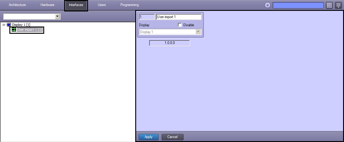 To activate the User Import software module create the User Import object on the basis of the Display object on the Interface tab of the System settings dialog window.