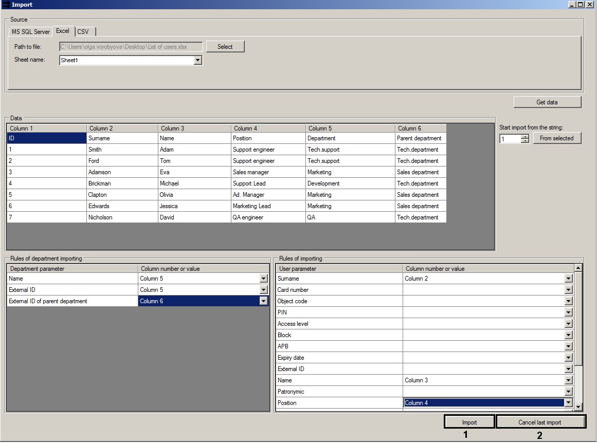 After setting parameters it's required to start user importing process. To start the import process click the Import button (1).