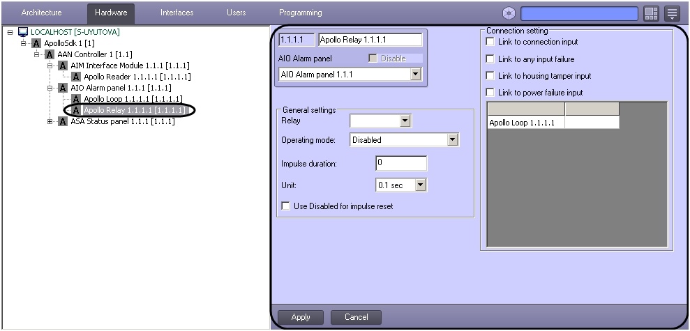 The AIO alarm panel's relay is configured on the settings panel of the corresponding object. An Apollo Relay object is created based on an AIO Alarm Panel object.