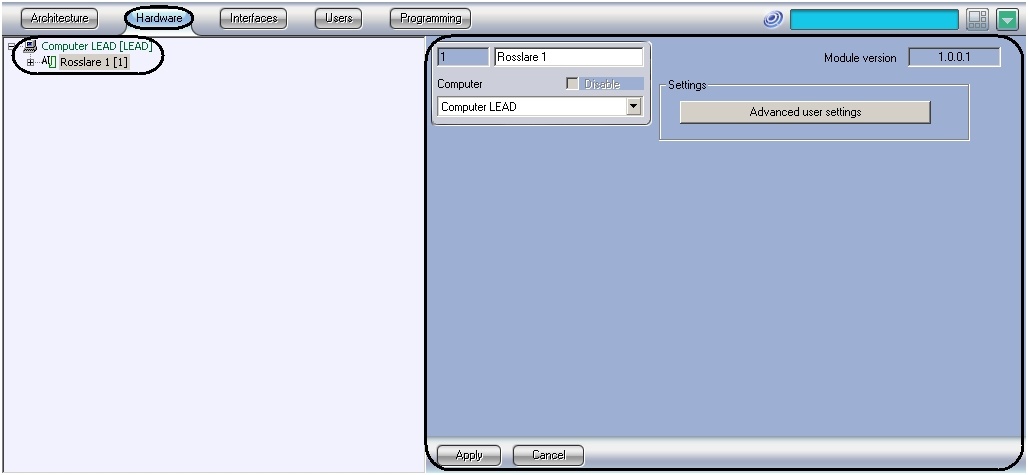 In order to activate Rosslare integration module it’s necessary to create the Rosslare object on the basis of the Computer object on the Hardware tab of the System settings dialog box.