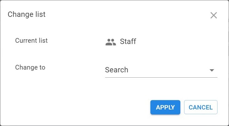 - In the window that opens, in the Change to field, from the drop-down list, select the list of LPs to which you want to move the license plates. Click the APPLY button. Click the CANCEL button to cancel the action.