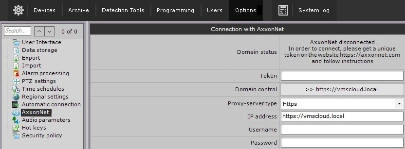 - On the computer on which the Axxon One Server is installed, specify the cloud address with the protocol.