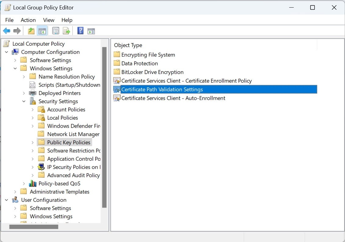 - Select Windows Settings → Security Settings → Public Key Policies → Certificate Path Validation Settings.