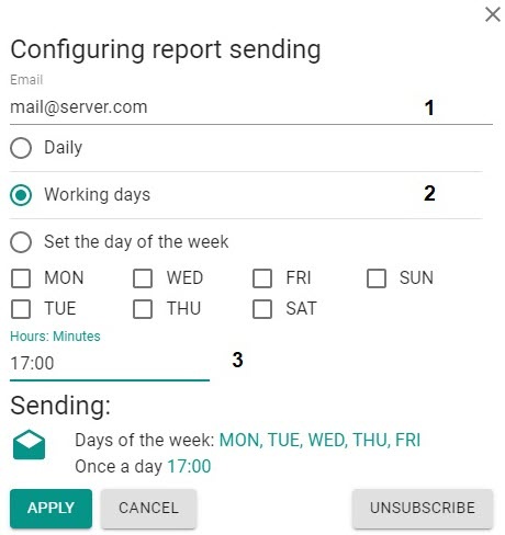 The report schedule has been set up. To delete it,  click the Unsubscribe button. To save the new schedule, click the Apply button again.