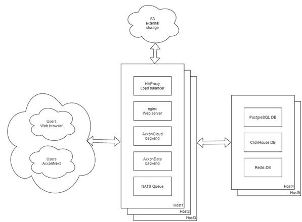 Axxon Datacenter integrates the Axxon One servers, video storages, databases, user web-clients and other solutions into a single system using various infrastructure products (see General building principles of Axxon Datacenter distributed video surveillance system). Example of Axxon Datacenter structure: