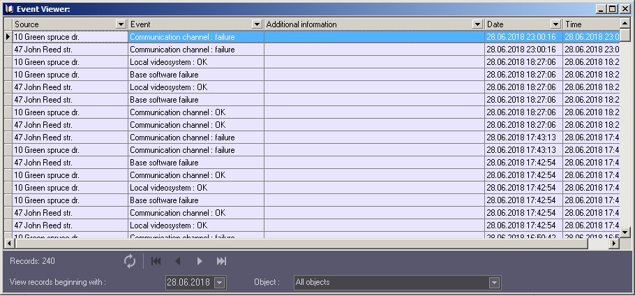 The disadvantage of viewing information via the Event Viewer is clearing the screen on each Intellect restart. It is impossible to see what was on before the system restart. The additional Event Viewer utility is required in such cases. This utility operates the database directly and allows to view information from the whole length of time used to keep the event log in the database.