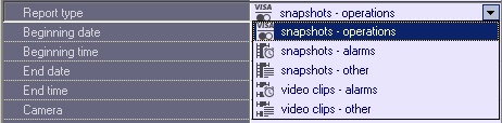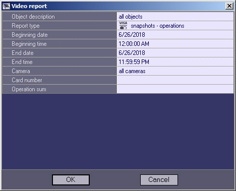- If the snapshots – operations report type is chosen, the Camera ID, Card number, and Operation sum settings become available.