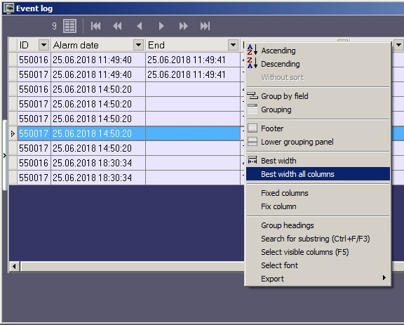 If not all columns fit in the visible area of the Event log window, a scrollbar becomes available. During scrolling, some columns that should always remain visible (such as alarm date and processing date) are shifted. To fix these columns, in the context menu, select Fix column.