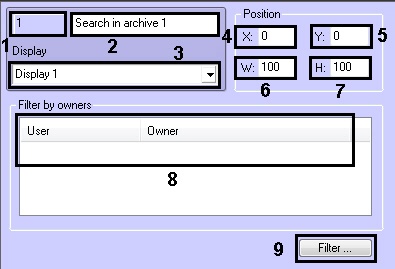 4 | X: | Enter the value in the field | Set the X coordinate in the horizontal axis for the upper-left corner of the Search in archive interface box | % of the screen width | 0 | from 0 to 100. When more than one monitor is connected to the computer it is possible to use coordinates outside this range, but it is not recommended to use coordinates less than -200. |