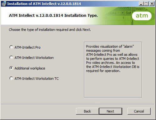 The ATM Intellect software in the Additional workplace configuration should be installed on Server/Remote administrator workplace. For details, see Intellect. Administrator's Guide.