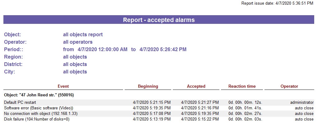 2. auto close - automatic closure of an alarm (available only when the accepted alarms report type is selected);