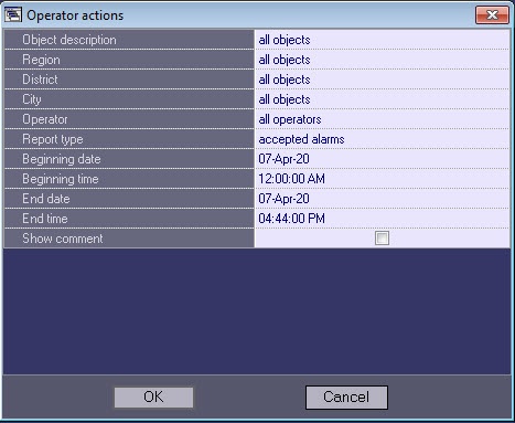 6. Show comment. Set this checkbox if it is necessary to display alarm comments in the report (see Processing alarms).
