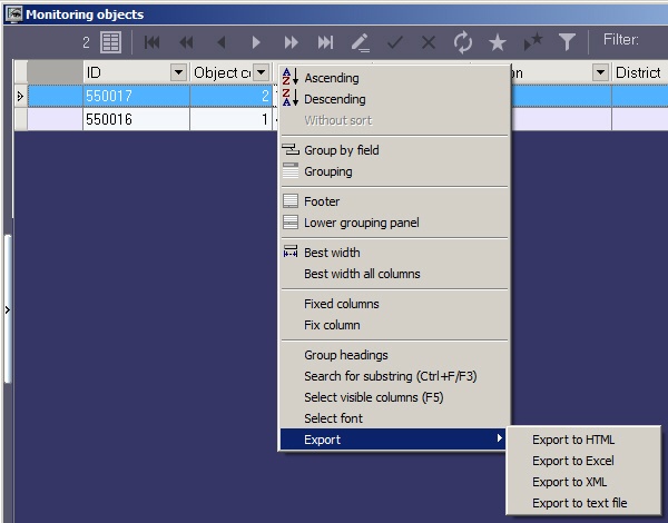 If you right-click the header of any column in the Monitoring objects window, a context menu appears, which allows performing various actions similar to the ones for the Event log (see Event log export and Configuring the event log columns position).