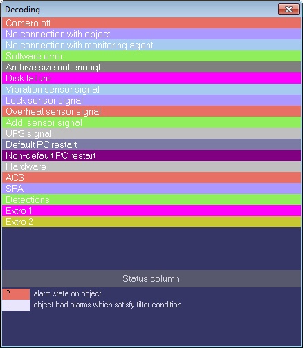 Alarm situations in the Log panel are shown in a table with colored rows. The color of each alarm corresponds to the alarm type. The color assignments can be viewed by clicking the