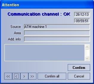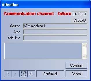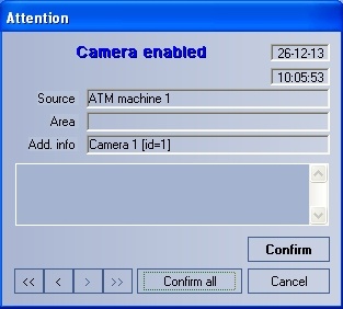 If there is the Alarm messages window object in the settings tree of Intellect software, the alarm situations will be displayed in the Control panel and Log panel interface objects and in the separate pop-up window. Examples of such pop-up windows are displayed in figures.