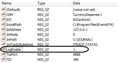 If errors arise in use of ATM Event Capture, it may become necessary to view its event log. To enable logging in ATM Event Capture, change the registry key for the following setting from "0" to "1": HKLM\SOFTWARE\ITV\EventATM\LogEnable for 32-bit OS (HKLM\SOFTWARE\Wow6432Node\ITV\EventATM\LogEnable for 64-bit). After you quit and start ATM Event Capture again, the file EventATM.log appears in the installation folder.
