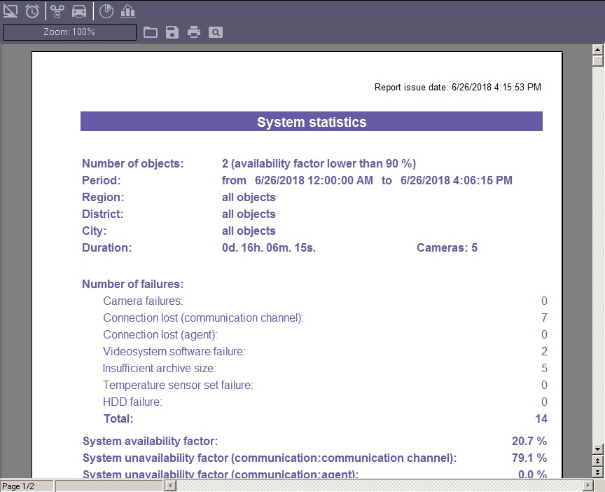 A sample overall report for the entire system is shown in the figure. The availability and unavailability factors  in the report are calculated by arithmetic averaging.