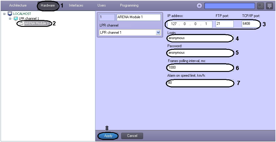3. In the IP address field enter the IP-address of the Arena computer with installed ftp-server (3).