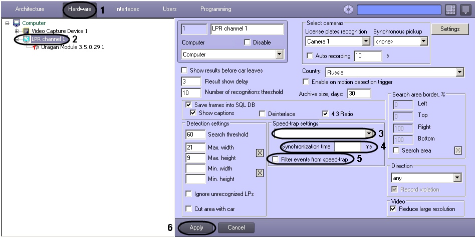 - In the Speed-trap settings drop-down list, select the Speed-trap object representing the speed-trap device directed at the same lane as the LPR channel camera (3).