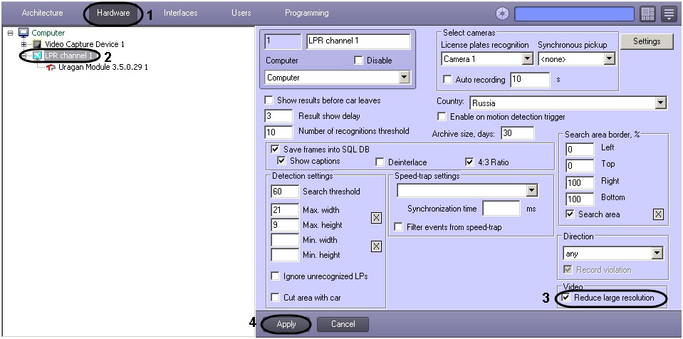 Half-frame processing is to be performed using the image interlaced scanning (Reduce large resolution check box is set). Receiving the next frame the new one consisting of even rows of the initial frame is processed if the Reduce large resolution check box is set. By default, the LPR channel processes the frame.