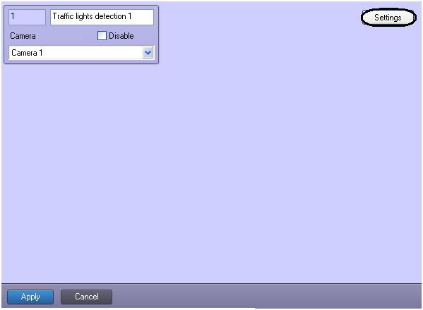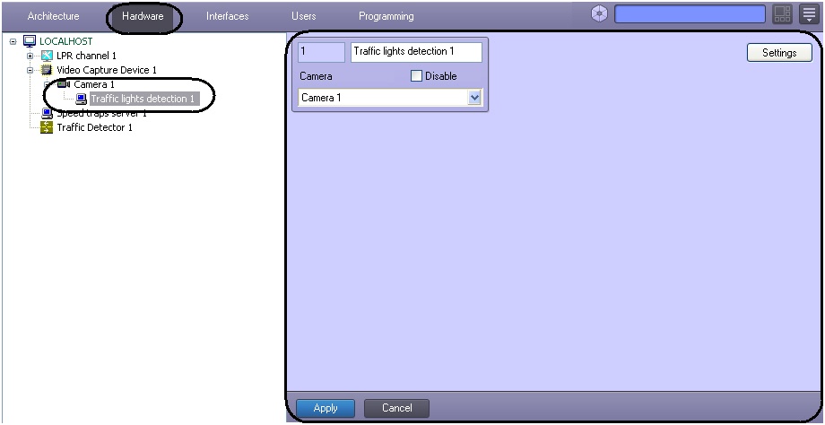 Setting up the Traffic Lights Detection software module is performed on the corresponding settings panel. The Traffic Lights Detection object is created under the Camera object in the Hardware tab of System settings dialog box.