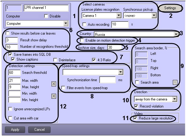 4 | Enable on motion detection trigger | Checkbox | Starting auto recording on receiving an event from the motion detector | Boolean | No | For normal mode: Yes – if the camera is armed, the LPR channel scans all video images til the basic motion detection of the Intellect software is in the Alarm mode; If the camera is not armed, the LPR doesn't work, but manual start using scripts is available (see item 6 in the Scripts used in the Auto-Intellect software package section). Recognition will process frames untill the stop command will be done. No – the LRP channel scans video images permanently. For Parking mode: Yes –if the camera is armed, the LPR channel scans all video images, until the plate will be recognized, after it recognition stops even if the Alarm mode is still in process and procedure repeats when the new trigger of alarm is activated; if the camera is not armed, the LPR doesn't work, but manual start using scripts is available (see item 6 in the Scripts used in the Auto-Intellect software package section). Recognition will process frames untill the plate will be recognizied and then will stop before new manual start. No – the LRP channel scans video images permanently | |